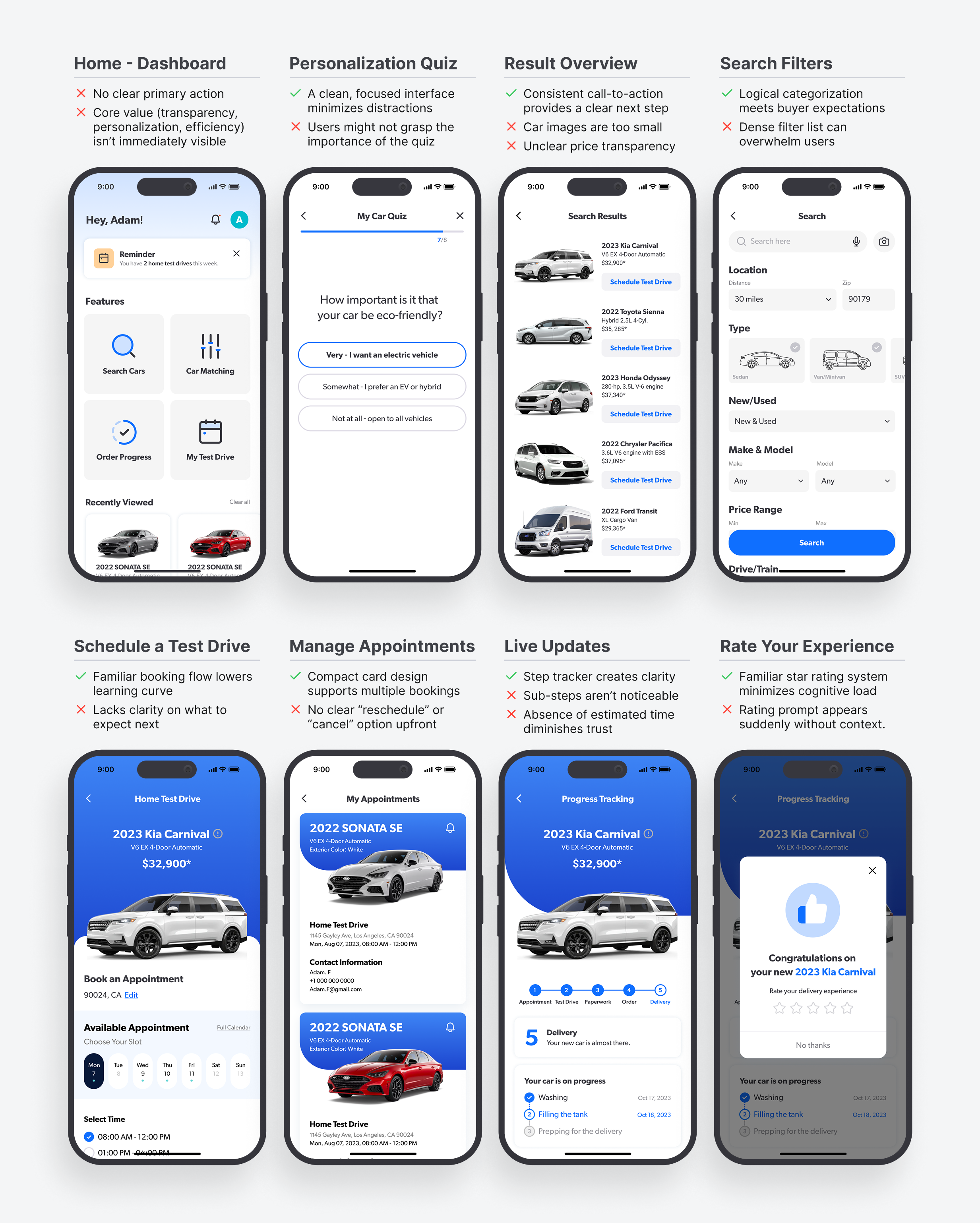 These opportunities became the backbone of our prototypes, ensuring that our solutions address user frustrations throughout the entire car-buying journey, from research to post-purchase.