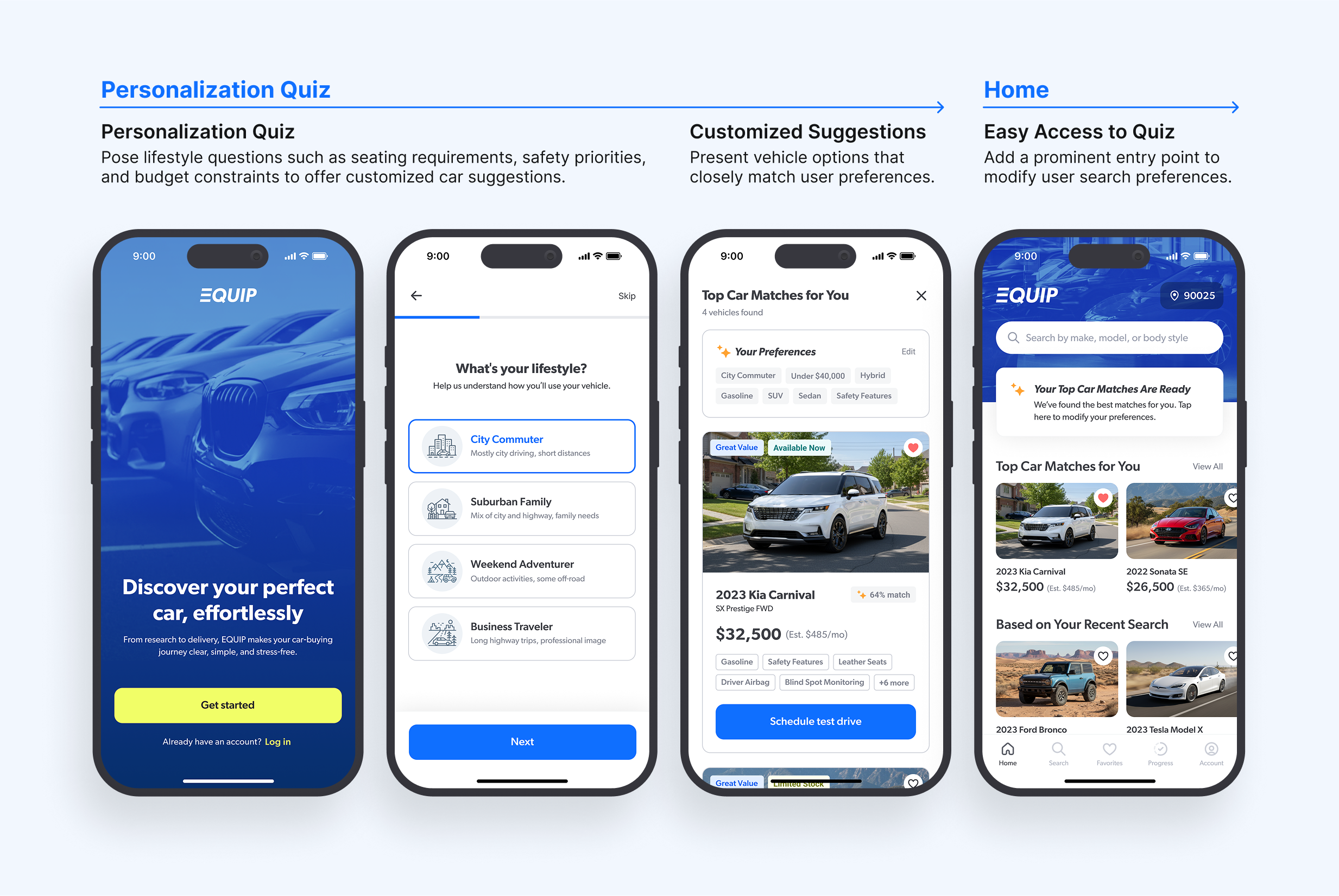To reduce decision fatigue, EQUIP begins with a guided personalization quiz that translates lifestyle needs into tailored car recommendations. The updated flow surfaces clear preferences, highlights top matches, and allows users to adjust criteria anytime from the home screen. By prioritizing hierarchy and simplicity, this feature helps buyers feel confident that they are seeing cars that truly fit their lives.