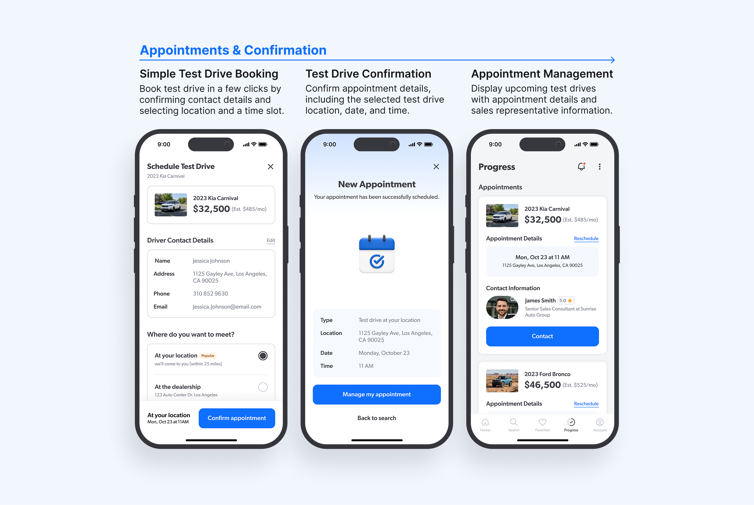 Scheduling a test drive is reduced to a few straightforward steps, supported by clear confirmation states and easily managed appointments. This flow eliminates the ambiguity often tied to dealership visits, ensuring buyers know exactly when, where, and how their test drives will happen. By surfacing details clearly, EQUIP strengthens trust and predictability in the car-buying process.