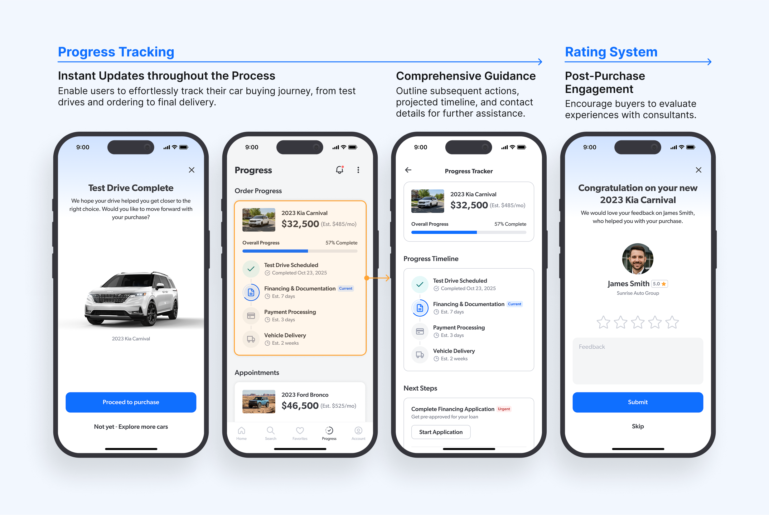 EQUIP keeps buyers informed with a transparent progress tracker, outlining each step from test drive to delivery. Sub-steps, timelines, and next actions are surfaced clearly, giving users a sense of control and reducing uncertainty. After purchase, the built-in rating system closes the loop by encouraging feedback and reinforcing accountability between buyers and dealerships.