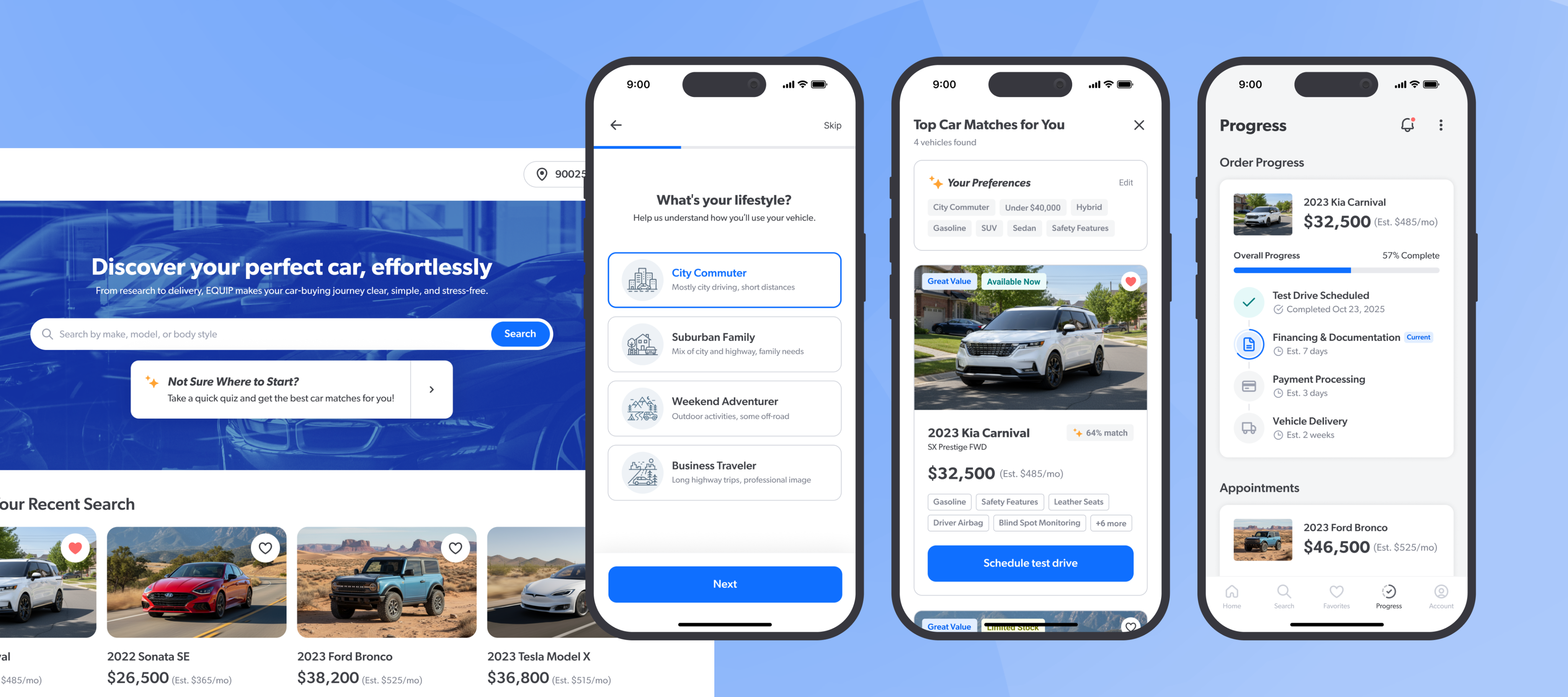 We designed a streamlined, transparent car-buying experience that combines personalization and clarity at every step. Equip integrates a personalized onboarding quiz, advanced search, intuitive appointment management, and real-time progress tracking to help buyers feel in control from research to delivery.
