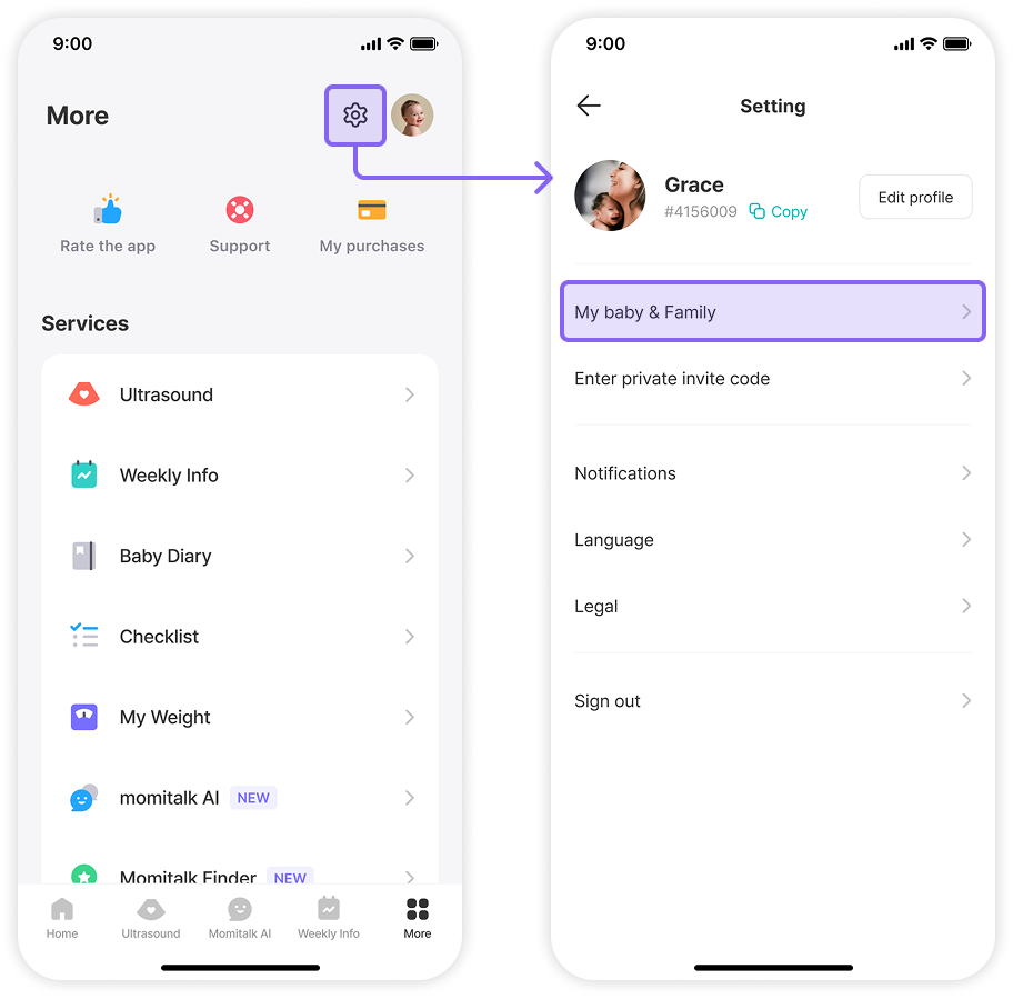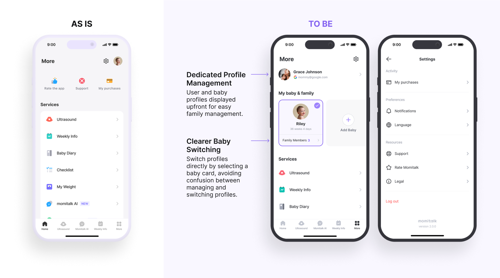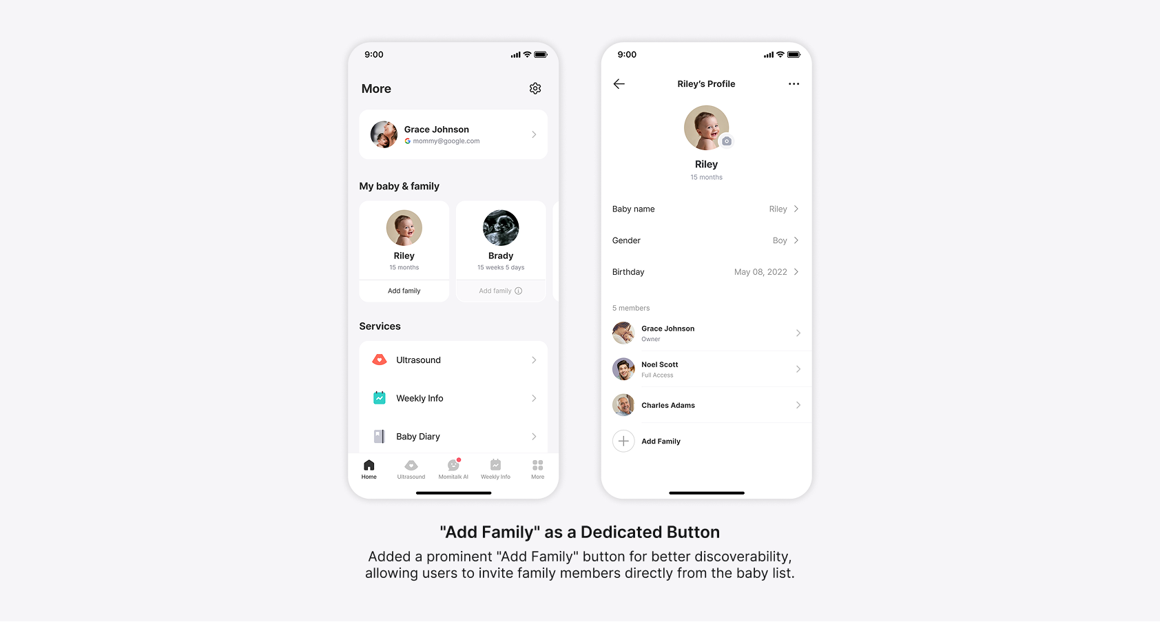 To reduce confusion and improve navigation efficiency, I restructured the “More” tab into a clearly segmented profile management area. The updated design distinctly separates user profiles, baby profiles, and family member controls, eliminating the previous ambiguity around profile switching and management. Key improvements include: