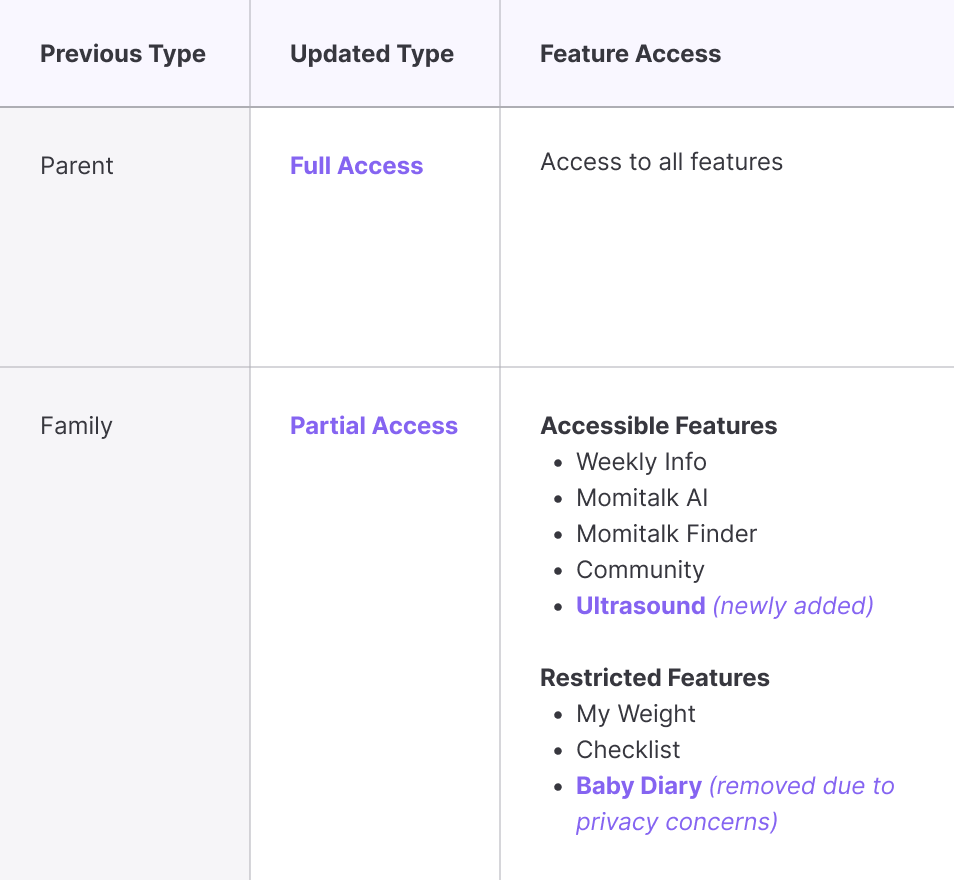 To start the redesign, the product manager and I redefined access levels to eliminate confusion and improve engagement. The original “Parent” and “Family” roles caused frequent misunderstandings. Users were unsure of permissions, especially for features like ultrasound access. To simplify role clarity and improve engagement, we: