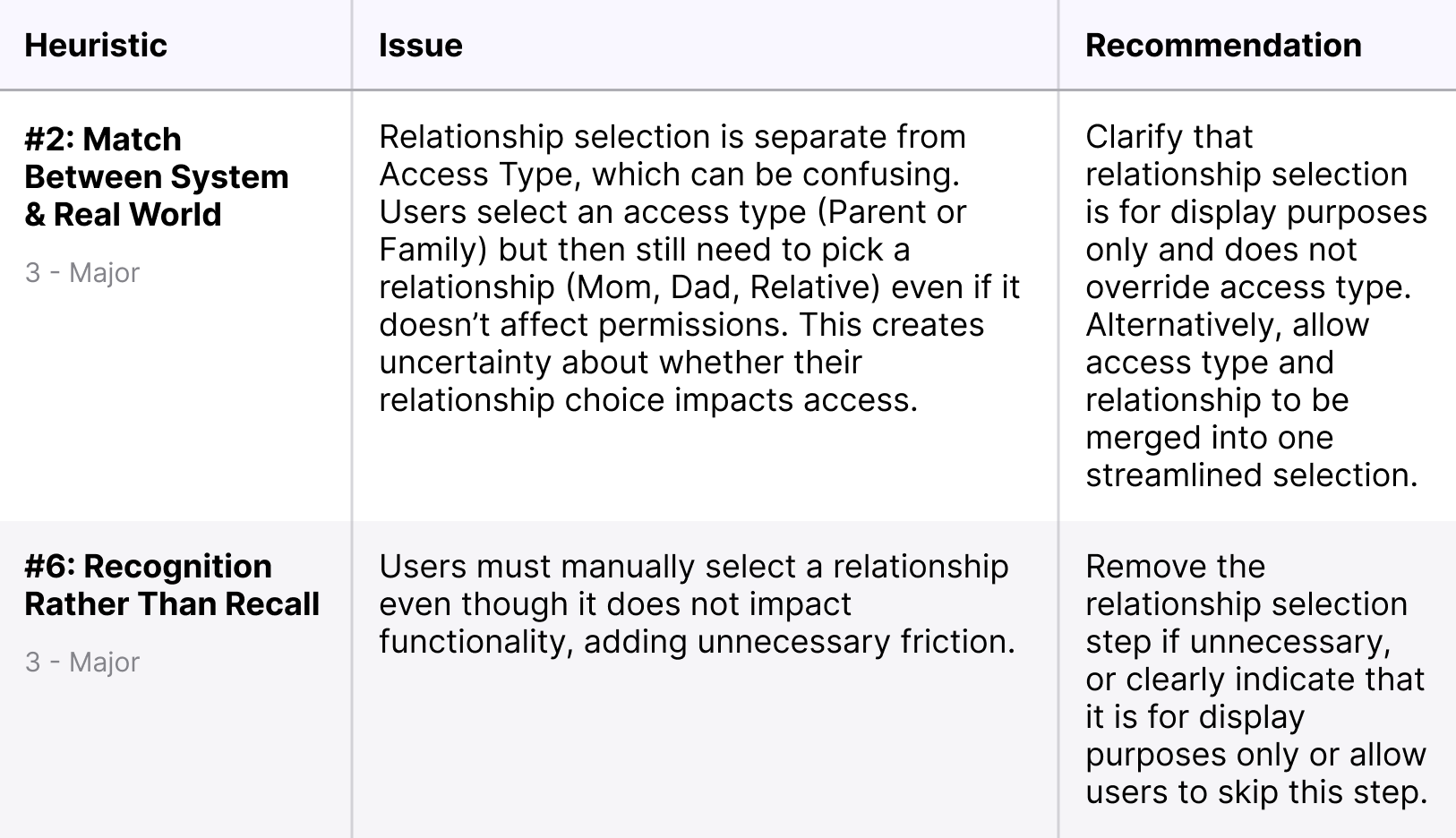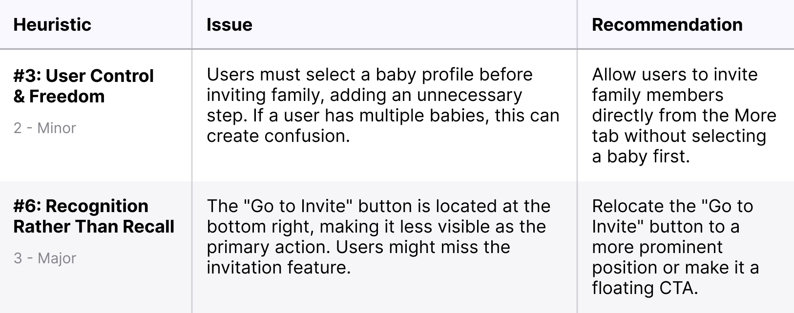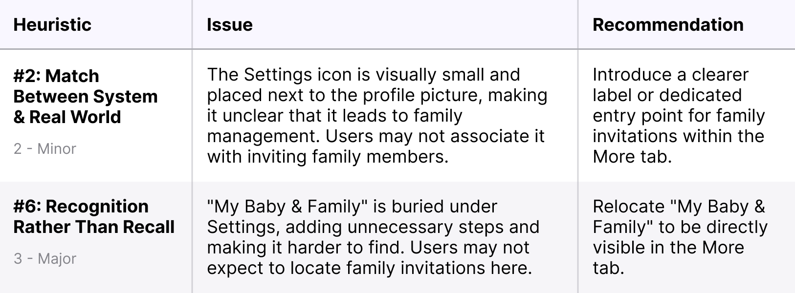 To assess the further usability of the Family Invitation Flow within the More tab, I conducted a heuristic evaluation using Jakob Nielsen’s 10 Usability Heuristics. The goal was to identify friction points, navigation inefficiencies, and areas where users might struggle. Through this evaluation, I was able to identify major friction points in the family invitation flow: