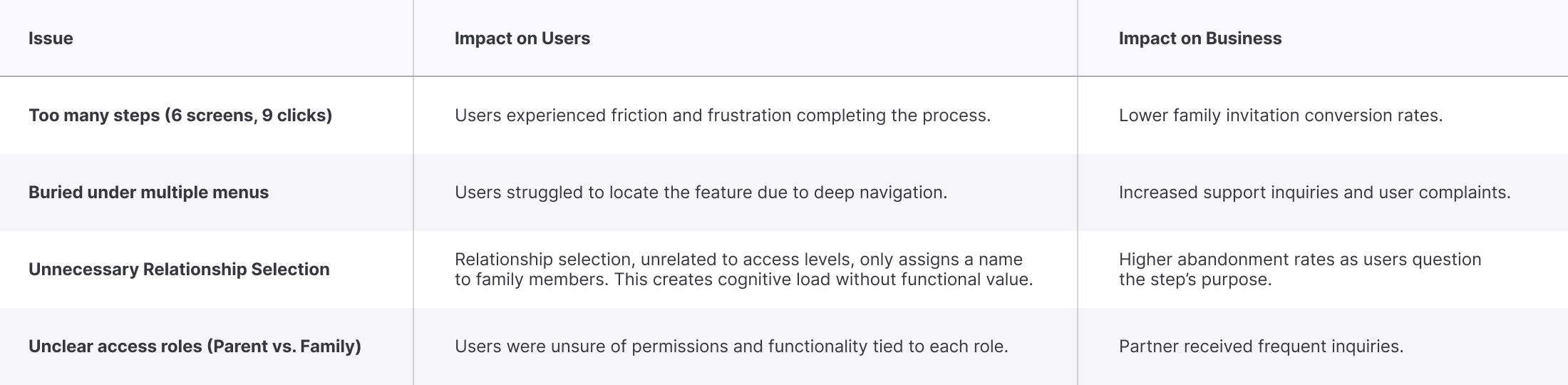 The original family invitation flow was hard to find, overly complex, and unclear about user roles and access levels. This caused confusion among users, limited adoption of collaborative features, and generated high volumes of support tickets, negatively impacting both user satisfaction and clinical partner operations.