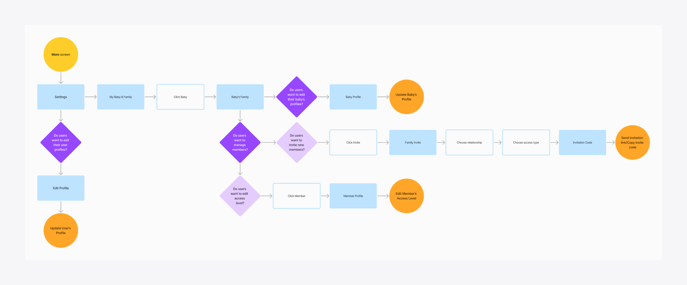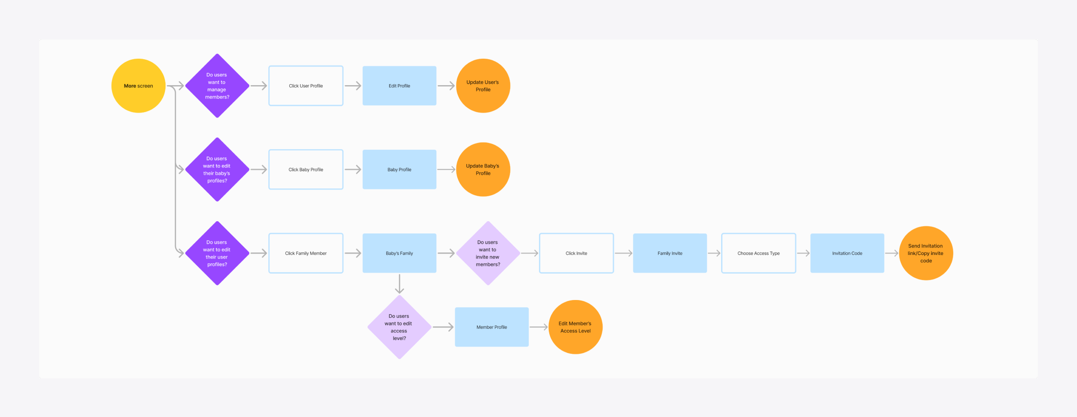 To uncover challenges in the More tab's key user flows, I analyzed the three main tasks users perform: managing family members, baby profiles and user profiles. An in-depth analysis of user interactions in the original family invitation flow, a primary challenge for this project, revealed critical usability bottlenecks: