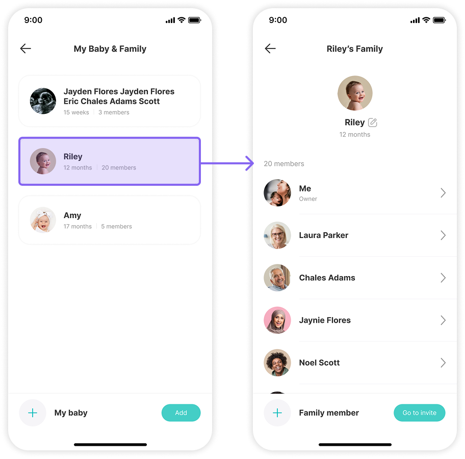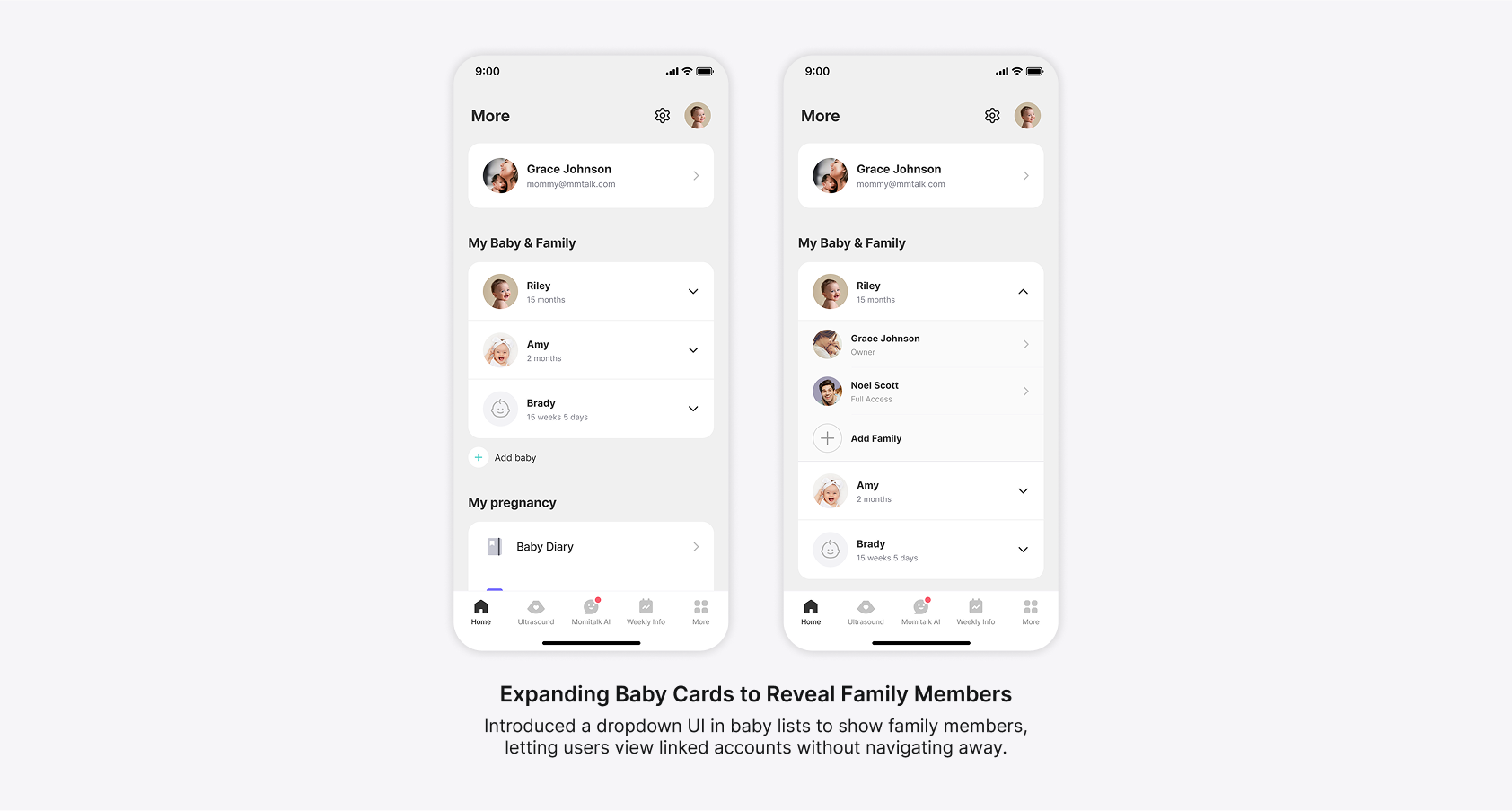 To reduce clutter, I tested a progressive disclosure approach, allowing users to expand baby profiles to reveal family members. While this kept the UI clean, it introduced interaction confusion and scalability problems: