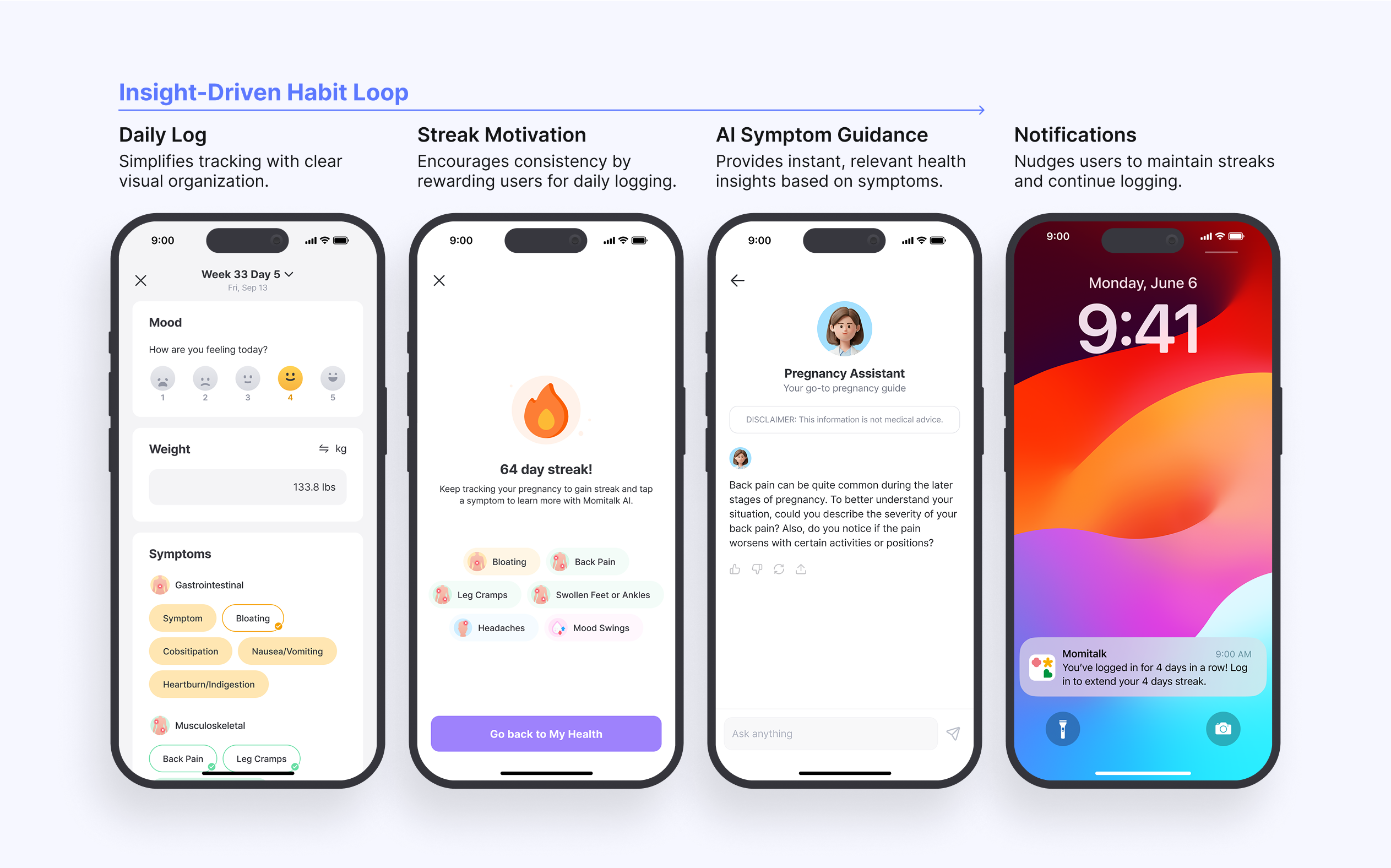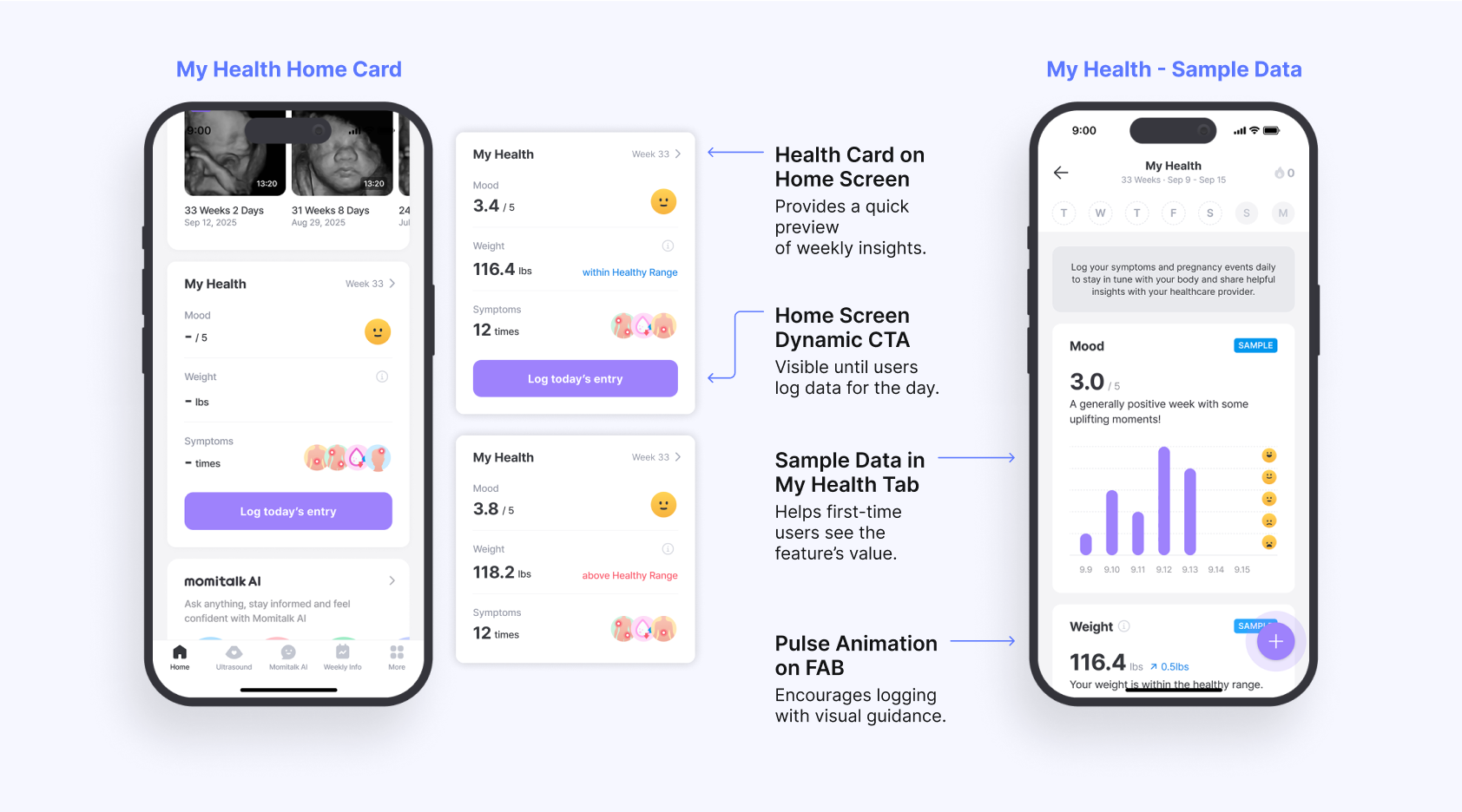 Momitalk is a pregnancy app designed to support expectant mothers with personalized tools and resources. One of its original features, My Weight, was created to help users track their weight during pregnancy. This project evolved the basic weight tracker into a comprehensive and habit-forming logging experience called My Health.