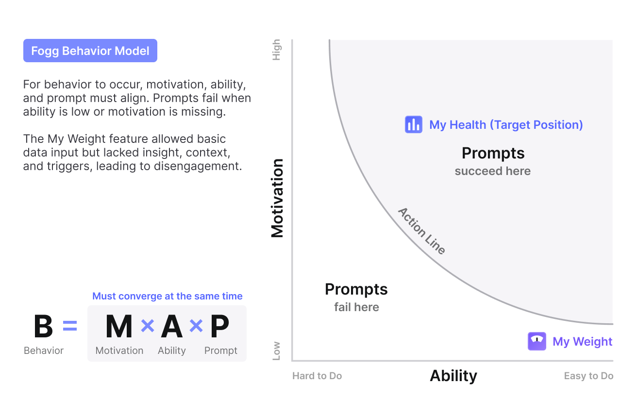 “What prevents expectant mothers from building a logging habit, and how can we help them succeed?” To answer this, I used Fogg’s Behavior Model to analyze user behavior around My Weight. This states that behavior happens when Motivation, Ability, and a Prompt converge. If any of them is missing, desired behavior is unlikely to happen.