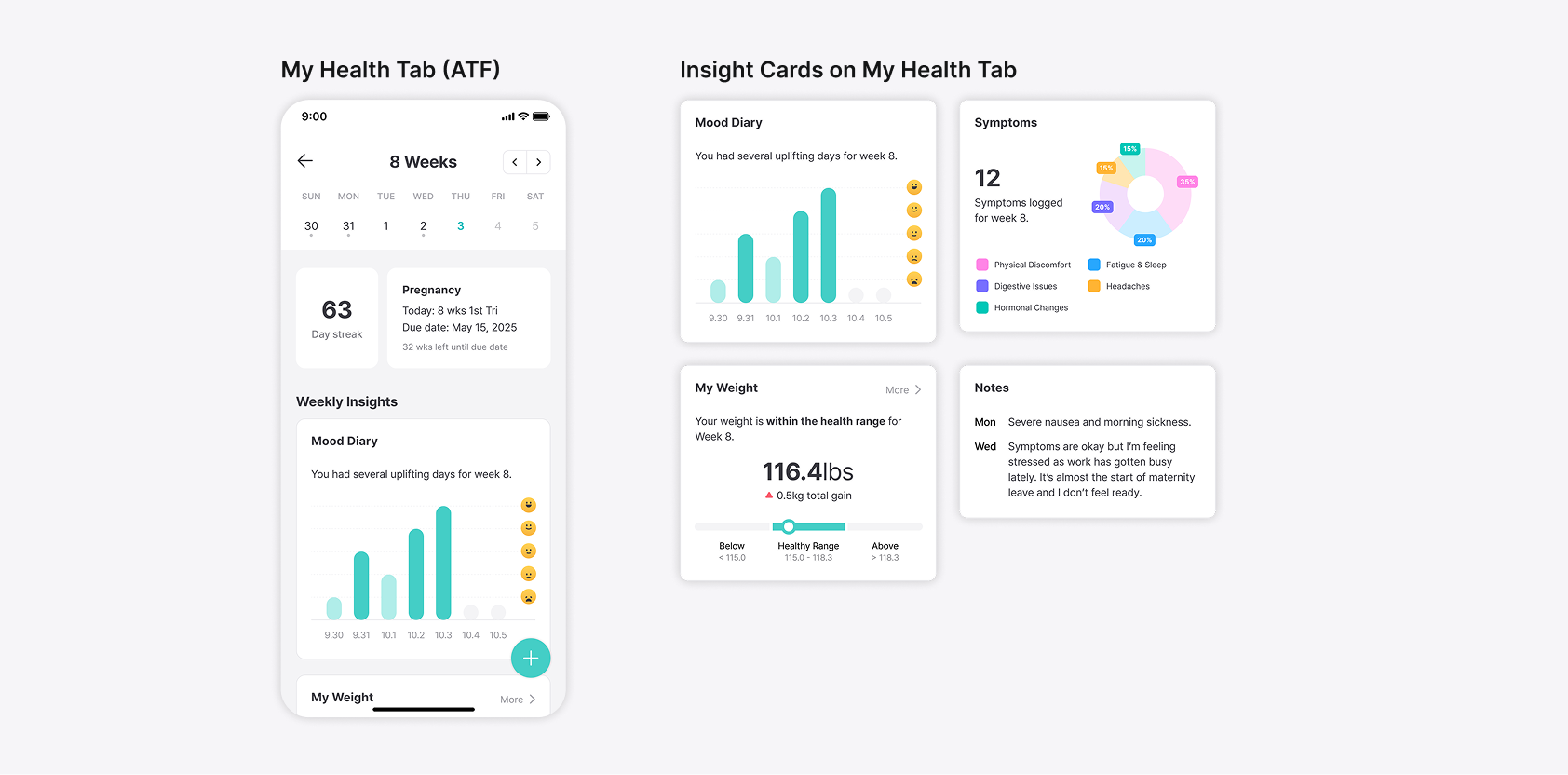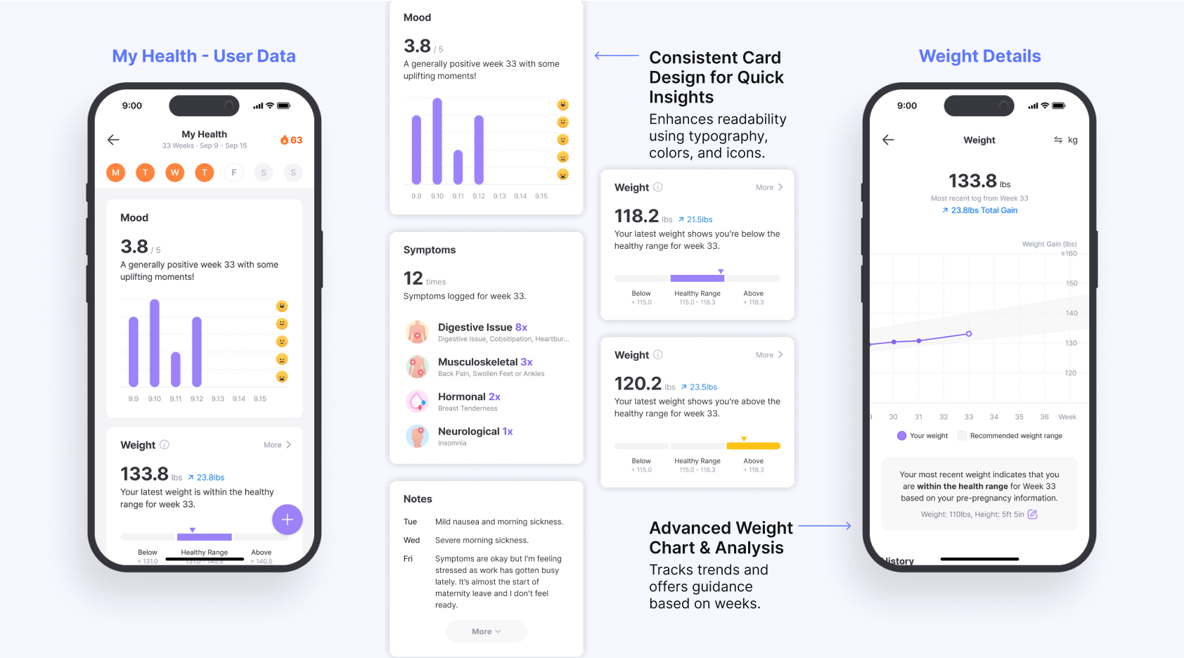 Tracking weight alone lacked context. Users couldn’t relate it to mood, symptoms, or what was expected at pregnancy stages, making the data feel abstract and unhelpful.