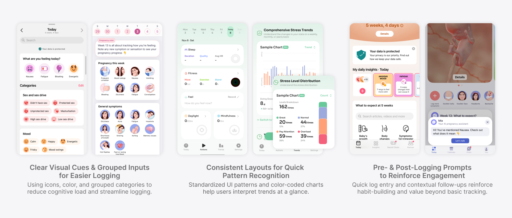 Cognitive load and input steps must be reduced. Quick, icon-based logging and digestible data visualization lower the barrier for daily use.