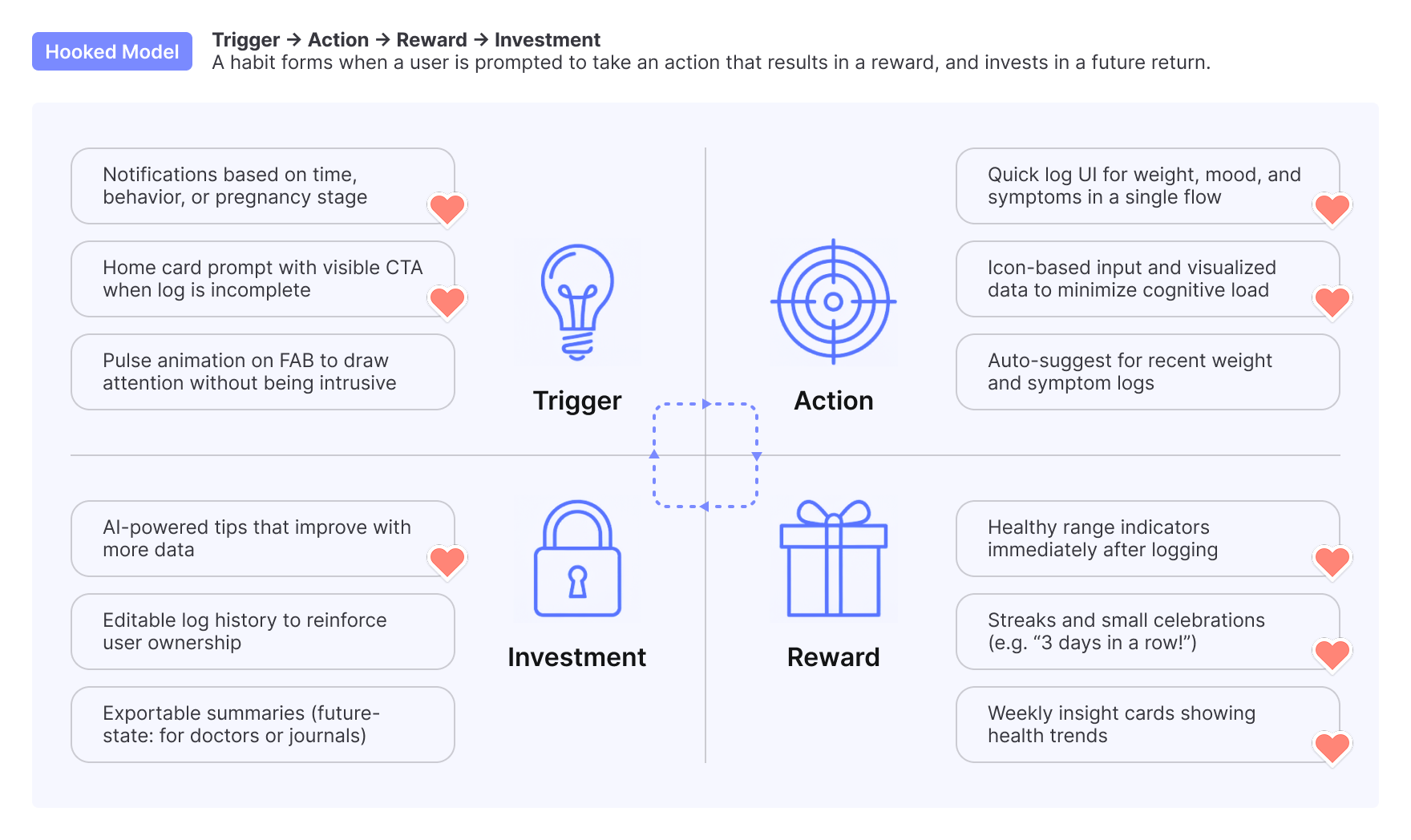 With the behavioral insights and product goals clearly defined, I used the Hooked Model to structure ideation, ensuring that each feature aligned with a habit-building loop rather than a one-time action. This framework helped prioritize not just what features to build, but when and why they should appear in the user journey.