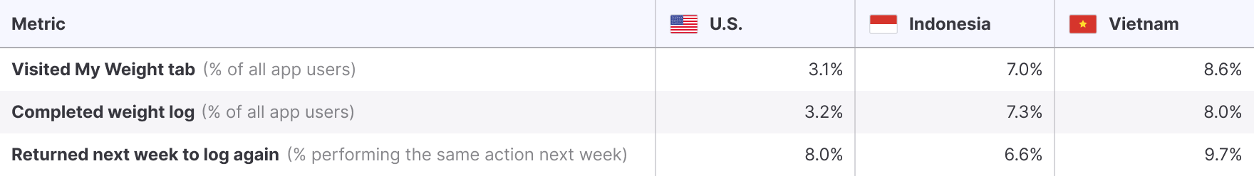 Before redesigning the logging experience, I analyzed usage data from My Weight — the existing weight logging feature. Across all key markets, engagement was consistently low. 3–8% of users ever interacted with the feature, and, among those who logged their weight, weekly retention dropped below 10%. These numbers revealed that: